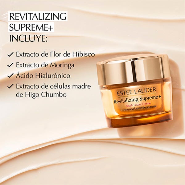 Extracto de Células Madre de Higo Chumbo y Ácido Hialurónico: Otros ingredientes de alto rendimiento se suman al poder de Revitalizing Supreme+. Ayudan a reforzar la barrera de hidratación de la piel y sellar la humedad, y el Ácido Hialurónico ayuda a hidratar y rellenar visiblemente la piel.