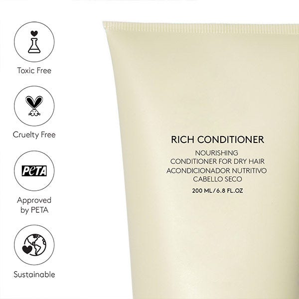 El acondicionador RICH cuenta con un avanzado I+D de nutrientes naturales y es perfecto para cabello seco, dañado, rizado o teñido. Desenreda al instante, hidrata la hebra desde dentro, repara las puntas abiertas y aporta brillo, suavidad y cuerpo a la melena.