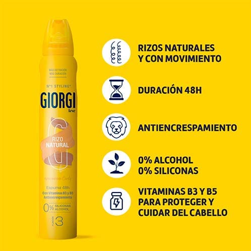 Prueba la Espuma Rizos Naturales de Giorgi, la espuma para conseguir unos rizos suaves, naturales y con movimiento durante 48 horas y sin encrespamiento gracias a sus activos acondicionadores.