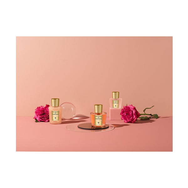 Una composición que abre con las notas suaves y vivas de la mandarina de Sicilia, la bergamota de Calabria y la pimienta. En el corazón, acentos intensos y aterciopelados de Peonía, Violeta y Lirio anticipan la riqueza envolvente de la Rosa Centifolia de Italia. La fragancia cierra con las notas cálidas y preciosas de la madera de cedro, el ámbar GRIS y el almizcle.