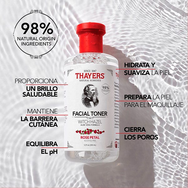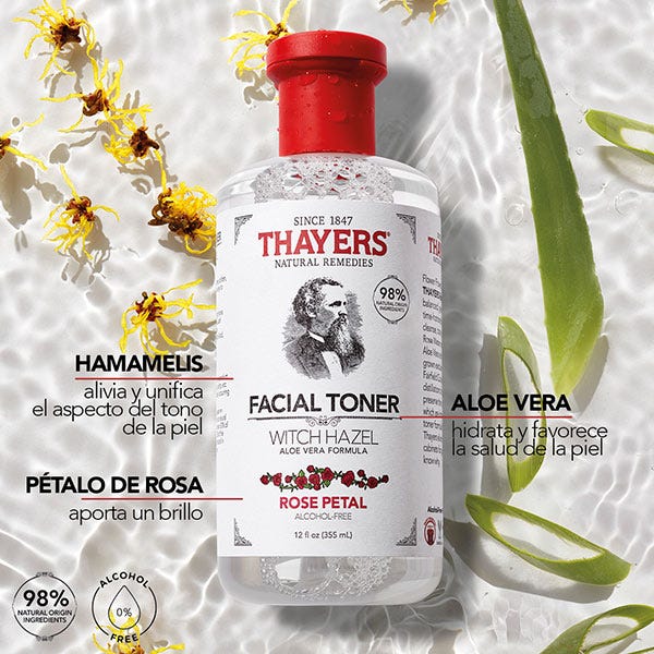 Descubre el tónico facial de Thayers de Pétalos de Rosa con tratamiento para darle brillo natural a tu piel.