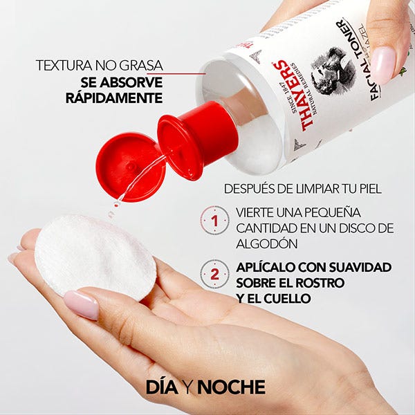 Después de la limpieza, humedece un algodón con el tónico de Thayers y pasar suavemente por la cara, cuello y escote comenzando desde la parte interna hacia la externa. Úsalo en tu rutina de mañana y noche. Apto para todo tipo de pieles.