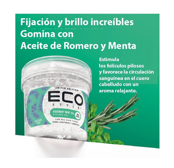 Gel fijador efecto gomina sin acartonamiento que estimula los folículos capilares y promueve la circulación sanguínea en el cuero cabelludo con una fragancia relajante a Romero y Menta.