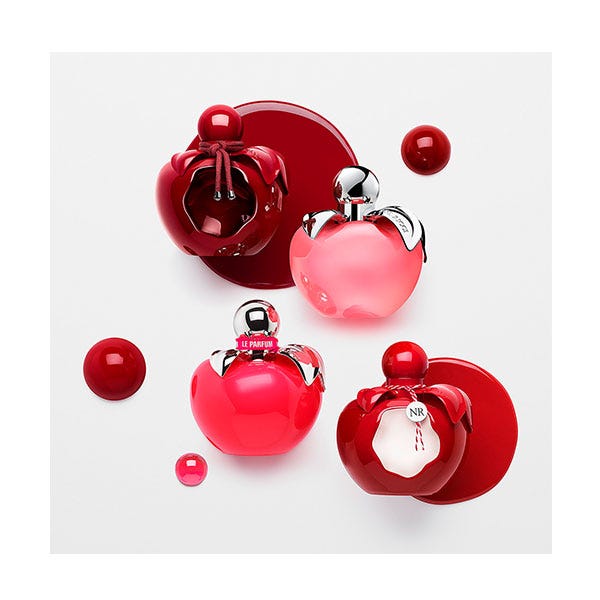 El icónico frasco en forma de manzana de Nina se reviste con una brillante laca rojo cereza que luce una mordedura en rojo oscuro, y está adornado con un cordoncito rojo. En el interior del estuche se oculta una obra de arte exclusiva de la artista Jeanine Brito, que continúa así la colaboración con la casa tras tu trabajo con el director artístico de Nina Ricci, Harris Reed.