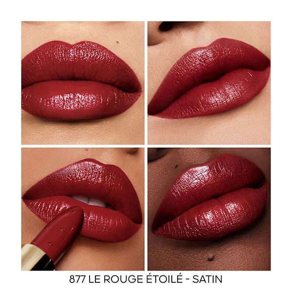 Las fórmulas satinada y mate aterciopelada de esta nueva generación de Rouge G se acompañan de una textura fundente ultraligera para generar una sensación de labios desnudos y garantizar 16 h de confort³. La fórmula satinada cubre los labios con una textura untuosa para redensificarlos y modelarlos a la perfección. Su acabado sedoso proporciona un brillo satinado de larga duración. La fórmula mate aterciopelada alisa y envuelve los labios con una suavidad inigualable para garantizar un resultado aterciopelado y una increíble fijación durante 12 h⁴.