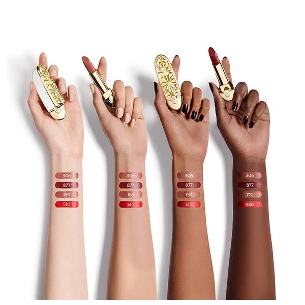 Rouge G se presenta en una paleta cromática diseñada para todos los estilos y tonos de piel. Cada tono ha sido elaborado por los laboratorios Guerlain con pigmentos incorporados uno a uno y realzados por el poder potenciador del color del aceite de Abisinia para conseguir tonos vibrantes y luminosos.