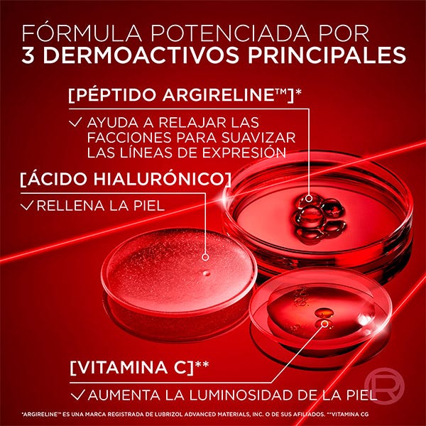 El Sérum Corrector Anti-Edad Revitalift Laser Tri-péptidos + Ácido Hialurónico + Vitamina Cg combina activos anti-edad de referencia. Resultados visibles en 2 semanas* en líneas de expresión, firmeza y luminosidad. Aplicar por la mañana y por la noche, solo o antes de la crema Revitalift Laser, sobre la piel limpia con movimientos ascendentes. *Autoevaluación a las 2 semanas, 75 mujeres.