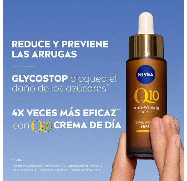 Q10 ANTIARRUGAS EXPERT SÉRUM DOBLE ACCIÓN: El Sérum Doble Acción Q10 Antiarrugas Expert con Tecnología Antiglicación potenciada por Q10 puro y GLYCOSTOP reduce incluso las arrugas más profundas y previene las nuevas causadas por la glicación.