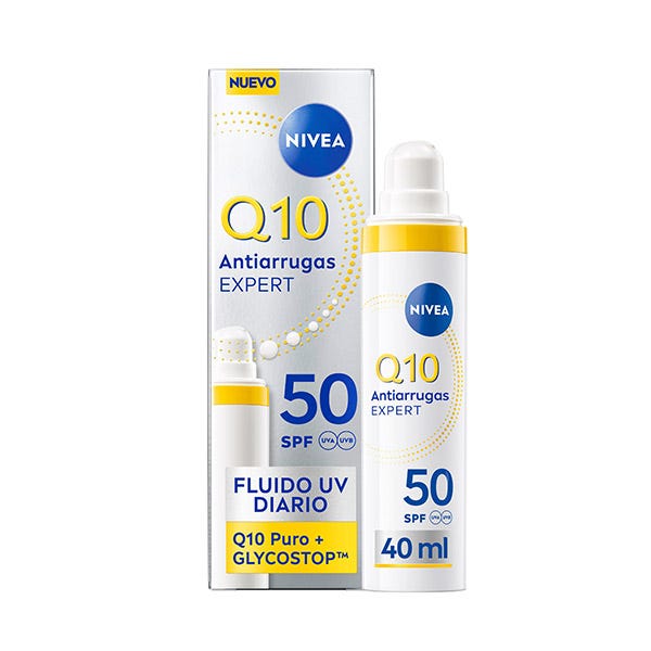 El NIVEA Q10 Antiarrugas Expert Fluido UV Diario SPF50 40ml protege la piel de los rayos UVA/UVB, previene la glicación y reduce las arrugas en un solo paso para una piel más joven y saludable. Su fórmula combina tres ingredientes clave: Coenzima Q10, que potencia la regeneración celular; GLYCOSTOP, que combate la rigidez del colágeno; y filtros UV de amplio espectro para prevenir el fotoenvejecimiento. Su fórmula ligera y de rápida absorción ha sido diseñada para proporcionar 12 horas de control de brillos, dejando un acabado mate y sin sensación grasosa, apto para todo tipo de pieles. Clínicamente probado. Los resultados son visibles desde la primera aplicación: la piel se siente más hidratada, suave y tersa. Tras dos semanas de uso del Q10 Fluido UV Diario SPF 50, el **76% de las mujeres confirman menos líneas de expresión y arrugas finas. En cuatro semanas, refuerza el sistema de defensa de la propia piel. Autoevaluación, 38 mujeres, 2024*Autoevaluación, 106 mujeres, 2024, 89% de acuerdo.