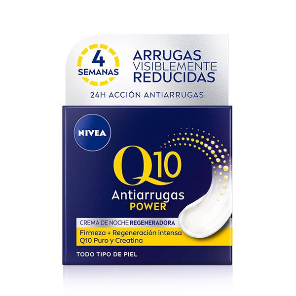 Q10 Antiarrugas POWER Crema de Noche: La Crema de Noche Regenadora hidrata la piel intensamente, regenera y reduce y previene las arrugas. Con doble booster de colágeno ayuda a reducir las arrugas en 7 días. Su fórmula contiene Q10 Puro para potenciar el colágeno de la piel y corregir las arrugas desde el interior, Creatina para reforzar la producción de colágeno y elastina y Ácido Hialurónico rellenar y alisar visiblemente las arrugas.