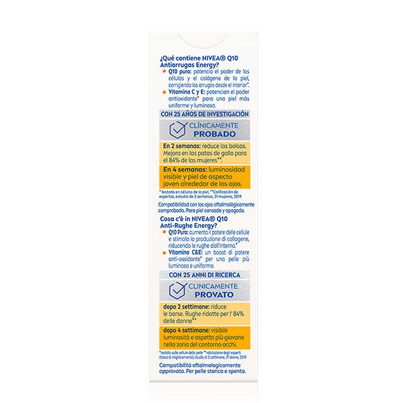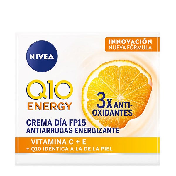 Q10 ENERGY Crema de Día Antiarrugas Energizante SPF15: Esta nueva fórmula de la Crema de Día Iluminadora Q10 Energy contiene Q10 Puro, 7X Vitamina C* y Guaraná, para reducir las arrugas, potenciar el efecto glow, y refrescar y recargar la piel. Consigue un glow instantáneo y una piel uniforme gracias a sus poderosos ingredientes.