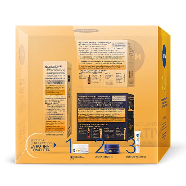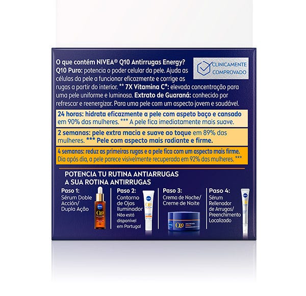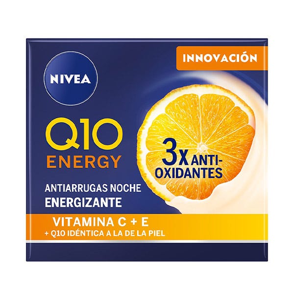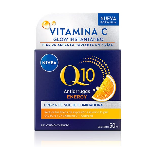 Q10 ENERGY Crema de Noche Antiarrugas Energizante: La nueva fórmula de la Crema de Noche Iluminadora Q10 Energy proporciona una piel de aspecto radiante en 7 días. Con Q10 Puro para potenciar el poder de la piel, 7x Vitamina C* que proporciona una piel uniforme y lumina y Extracto de Guaraná, conocido por sus propiedades resfrescantes y reenergizantes.