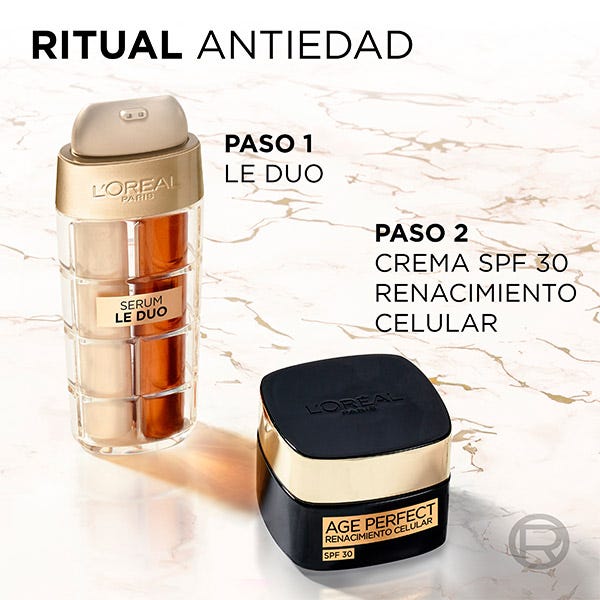 "Redescubre tu piel con el Set Age Perfect de L’Oréal Paris, un dúo de tratamiento avanzado formulado especialmente para mujeres con piel madura. Este set contiene dos productos complementarios: el Age Perfect Le Duo Sérum (30 ml) y la Crema Regeneradora Renacimiento Celular SPF 30 (50 ml), para una rutina de cuidado antiedad eficaz y transformadora.