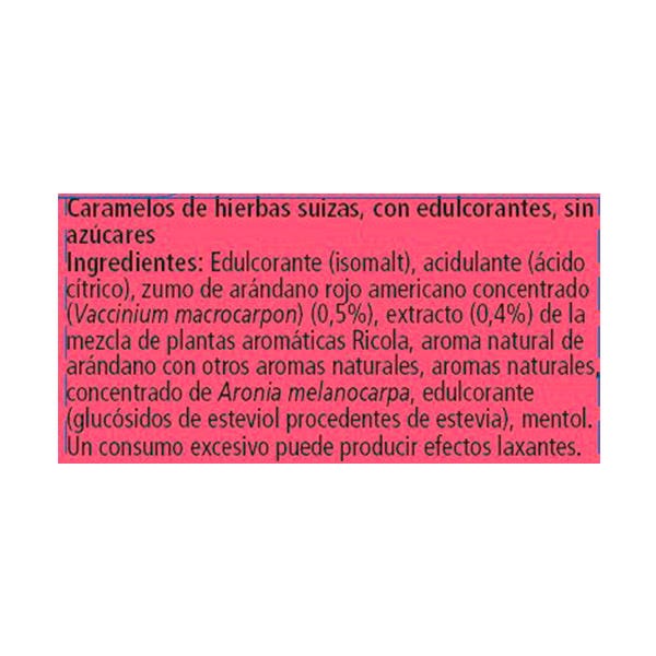 Edulcorante (isomalt), acidulante (ácido cítrico), zumo de arándano rojo americano concentrado (Vaccinium macrocarpon)(0,5%), extracto (0,4%) de la mezcla de plantas aromáticas Ricola, aroma natural de arándano con otros aromas naturales, aromas naturales, concentrado de Aronia melanocarpa, edulcorante (glucósidos de esteviol procedentes de la estevia), mentol.