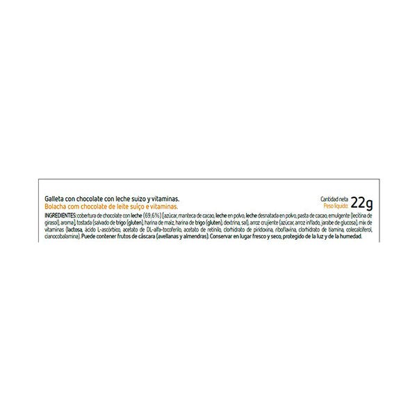 Cobertura de chocolate con leche (69,6%)(azúcar, manteca de cacao, leche en polvo, leche desnatada en polvo, pasta de cacao, emulgente (lecitina de girasol), aroma), tostada (salvado de trigo(gluten), harina de maíz, harina de trigo (gluten), dextrina, sal), arroz crujiente (azúcar, arroz inflado, jarabe de glucosa), mix de vitaminas (lactosa, ácido L-ascórbico, acetato de DL-alfa-tocoferilo, acetato de retinilo, clorhidrato de piridoxina, riboflavina, clorhidrato de tiamina, colecalciferol, cianocobalamina).
