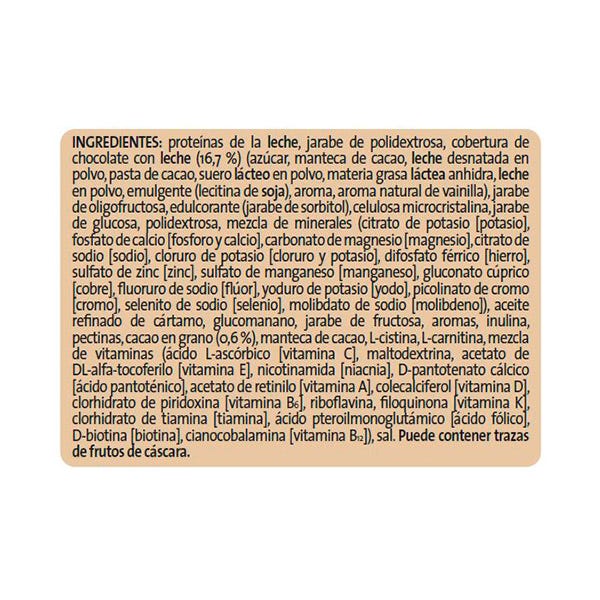 proteínas de la leche, jarabe de polidextrosa, cobertura de chocolate con leche (16,7€), (azúcar, manteca de cacao, leche desnatada en polvo, pasta de cacao, suero lácteo en polvo, materia grasa láctea anhidra, leche en polvo, emulgente (lecitina de soja), aroma, aroma natural de vainilla), jarabe de oligofructosa, edulcorante (jarabe de sorbitol), celulosa microcristalina, jarabe de glucosa, polidextrosa, mezcla de minerales (citrato de potasio (potasio), fosfato de calcio (fosforo y calcio), carbonato de magnesio (magnesio), citrato de sodio (sodio), cloruro de potasio (cloruro y potasio), difosfato férrico (hierro), sulfato de zinc (zinc), sulfato de manganeso (manganeso), gluconato cúprico (cobre), fluoruro de sodio (flúor), yoduro de potasio (yodo), picolinato de cromo (cromo), selenito de sodio (selenio), molibdato de sodio (molibdeno)), aceite refinado de cártamo, glucomanano, jarabe de fructosa, aromas, inulina, pectinas, cacao en grano (0,6%), manteca de cacao, L-cistina, L-carnitina, mezcla de vitaminas (ácido L-ascórbico (vitamina C), maltodextrina, acetato de DL-alfa-tocoferilo (vitamina E), nicotinamida (niacina), D-pantotenato cálcico (ácido pantoténico), acetato de retinilo (vitamina A), colecalciferol (vitamina D), clorhidrato de piridoxina (vitamina B6), riboflavina, filoquinona (vitamina K), clorhidrato de tiamina (tiamina), ácido pteroilmonoglutámico (ácido fólico), D-biotina (biotina), cianocobalamina (vitamina B12)), sal.