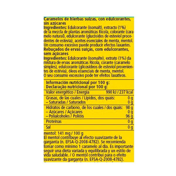 Edulcorante (isomalt), extracto (1%) de la mezcla de plantas aromáticas Ricola, colorante (caramelo natural), edulcorante (glucósidos de esteviol procedentes de la estevia), aceites esenciales de menta, mentol.