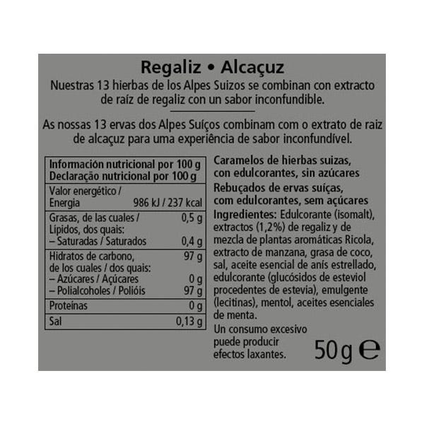 Edulcorante (isomalt), extractos (1,2%) de regaliz y de mezcla de plantas aromáticas Ricola, extracto de manzana, grasa de coco, sal, aceite esencial de anís estrellado, edulcorante (glucósidos de esteviol procedentes de la estevia), emulgente (lecitinas), mentol, aceites esenciales de menta.
