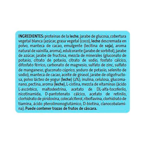 Proteínas de la leche, jarabe de glucosa, cobertura vegetal blanca (azúcar, grasa vegetal (coco), leche descremada en polvo, manteca de cacao, emulgente (lecitina de soja), aroma natural de vainilla, aroma), edulcorante (jarabe de sorbitol), jarabe de azúcar, jarabe de fructosa, mezcla de minerales (gluconato de potasio, citrato de potasio, citrato de sodio, fosfato cálcico, difosfato férrico, carbonato de magnesio, sulfato de zinc, sulfato de manganeso, gluconato cúprico, yoduro de potasio, selenito de sodio), manteca de cacao, aceite de girasol, jarabe de oligofructosa, polvo lácteo de yogur (leche)(2%), inulina celulosa, glucomanano, pectina, aroma (leche), L-cistina, mezcla de vitaminas (ácido L-ascórbico, maltodextrina, acetato de DL-alfa-tocoferilo, nicotinamida, D-pantotenato cálcico, acetato de retinilo, clorhidrato de piridoxina, colecalciferol, riboflavina, clorhidrato de tiamina, ácido pteroilmonoglutámico, D-biotina, cianocobalamina).