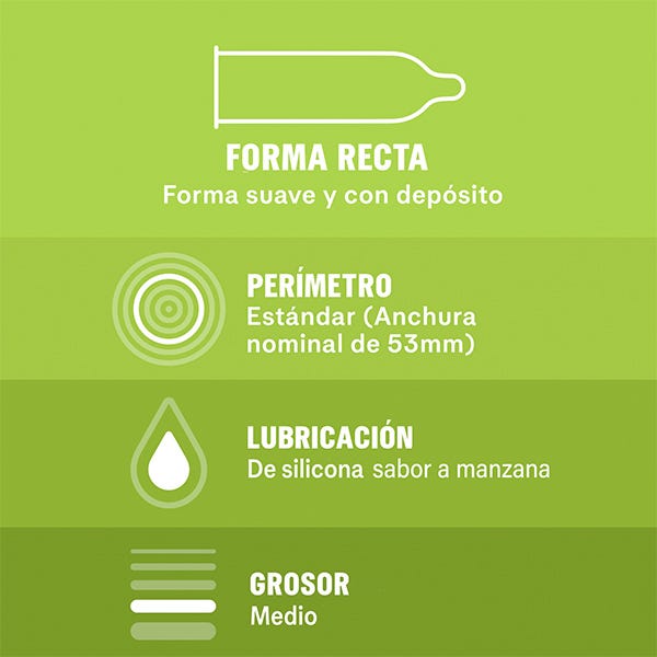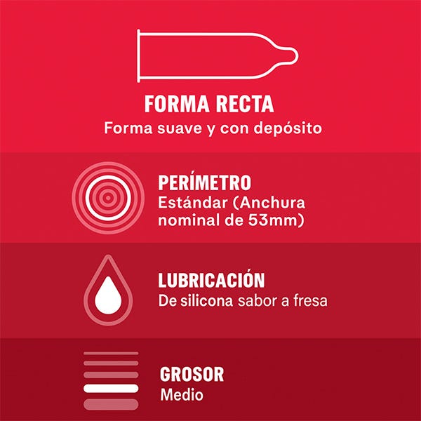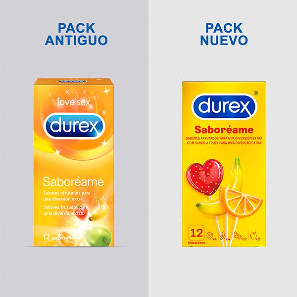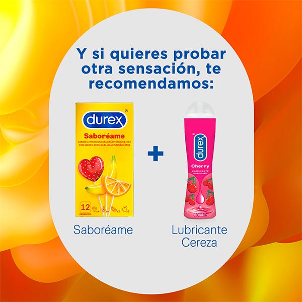Los preservativos Durex Saboréame están compuestos por preservativos sabor Fresa, Plátano, Naranja y Manzana para una diversión extra. Estos condones son lubricados y de forma recta con depósito.