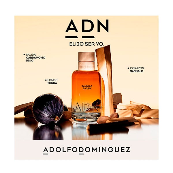 Sándalo Sacro es parte de la nueva colección, ADN, de Adolfo Domínguez. Una colección de Eau de Parfum, genderless, a base de aceites esenciales que potencian tu identidad. Sándalo Sacro, contiene aceite esencial de Sándalo, un aceite ancestral utilizado para calmar la mente y promover estabilidad emocional. Un perfume diseñado para potenciar quien eres. Elige ser tú.