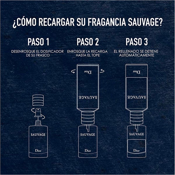 Su recarga ecoconcebida, fácil de usar, ahora le permite rellenar su frasco de eau de toilette Sauvage de 100 ml o 30 ml en un sencillo paso y sin perder ni una sola gota.
