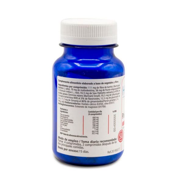 Maltodextrina, Saw Palmeto (Serenoa repens, fruto [45% ACIDOS GRASOS]), Uña de gato (Uncaria tomentosa Willd. (ex Schult) DC, corteza [3% Alcaloides], Gelatina bovina*, Zinc (Gluconato de Zinc [ 14% Zinc]), Ginseng (Panax ginseng, hoja [80% Gingenosidos]), Antiaglomerante (Sales magnésicas de ácidos grasos), Antiaglomerante (Dioxido de silicio).