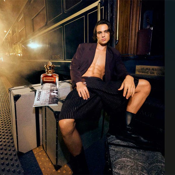 En la primera clase del tren Gaultier, Scandal Pour Homme Elixir reina sin frenos ni discreción, con su aroma ambarino, afrutado y amaderado. ¿Quién no sueña con encontrarse con su cereza negra, la insolencia de su pachulí, la suavidad de su haba tonka? Detrás del terciopelo rojo de su estuche exclusivo, hay lugar para el exceso y el lujo. Todo en él es tentación e intensidad: su degradado plateado, su corona resplandeciente, su jugo ambarino. Y si los pasajeros se indignan, ¡mejor que mejor! Eso es lo que él quiere.