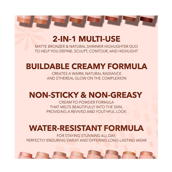 Consigue un brillo radiante y natural con MOIRA Sculpt & Glow Duo stick. Este versátil bronceador e iluminador 2 en 1 realza tus rasgos para un aspecto joven y bronceado. El bronceador mate y el iluminador brillante se combinan a la perfección para proporcionar una fórmula en polvo, resistente al agua, no pegajosa y no grasa que dura todo el día, incluso en condiciones húmedas. Añade luminosidad a tu cutis con este imprescindible de belleza.