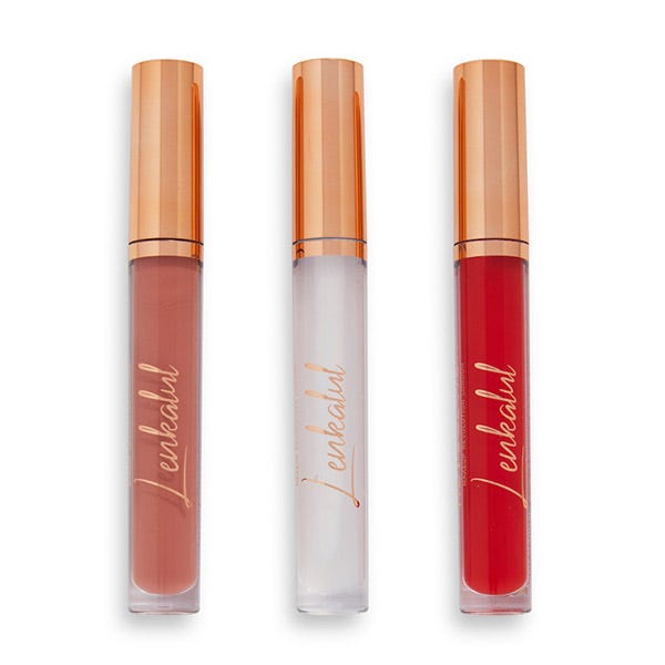 Si como Lena, te encantan los pucheros brillantes y naturales, no busques más allá del juego de brillo de labios Revoltuion X Lenkalul, que presenta un brillo transparente que se puede usar solo o como adorno para los labios, un nude y un saucy red.