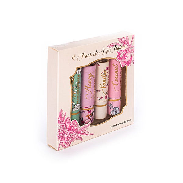 Con un packaging precioso y floral, llévate este set de cuatro bálsamos labiales con distintos sabores.
