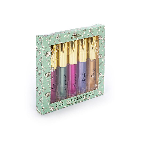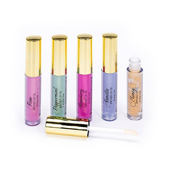 Contiene cinco bálsamos labiales de distintos sabores y colores. Acabado no pegajoso y super hidratante.