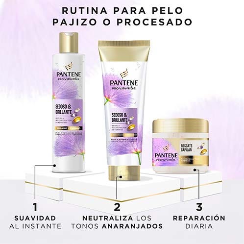 Elaborado con una mezcla específica de nutrientes, el acondicionador actúa para transformar el pelo encrespado. La colección de productos Sedoso Y Brillante para uso diario ofrece un cuidado capilar ideal para cabellos decolorados y con mechas. Descubre la colección completa de productos Sedoso Y Brillante: el champú Violeta y la mascarilla capilar