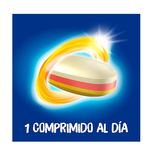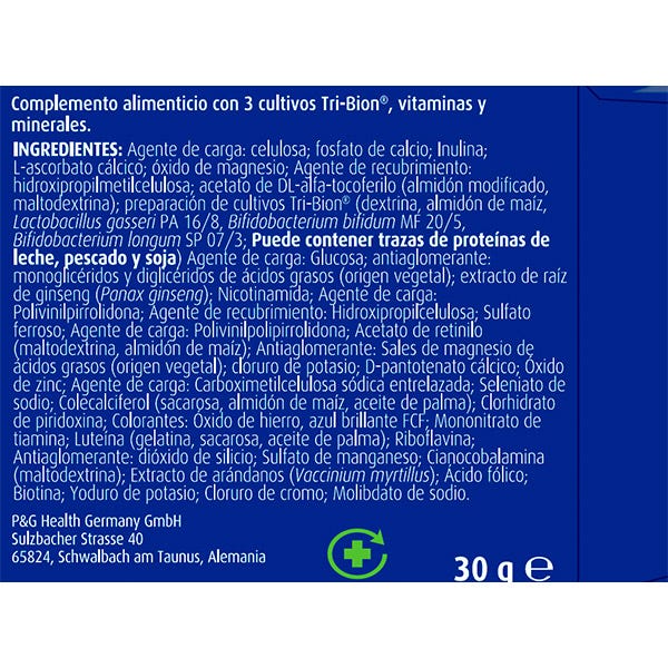 INGREDIENTES: Agente de carga: celulosa, fosfato de calcio; Inulina, L-ascorbato cálcico; óxido de magnesio; Agente de recubrimiento: hidroxipropilmetilcelulosa; acetato de DL-alfa-tocoferiIo (almidón modificado, maltodextrina); preparación de cultivos Tri-Bion (dextrina, almidón de maíz, loctobocilus gossei PA 16/8, Bifidoboctelium bifidum MF 20/5, Bifidobocterium longum SP 07 /3; Puede contener trazas de proteínas de leche, pescado y soja) Agente de carga: glucosa, antiaglomerante: monoglicéridos y diglicéridos de ácidos grasos (origen vegetal); extracto de raíz de ginseng (panax ginseng); nicotinamida; agente de carga: polivinilpirrolidona; agente de recubrimiento: hidroxipropelcelulosa; sulfato ferroso; Agente de carga: polivinilpolipirrolidona; acetato de retinilo(maltodextrina, almidón de maíz); antiaglomerante: sales de magnesio de ácidos grasos(origen vegetal9; cloruro de potasio; d-pantotenato cálcico; oxido de zinc; Agente de carga: carboximetilcelulosa sódica entrelazada; seleniato de sodio; colecalciferol(sacarosa, almidón de maíz, aceite de palma); clorhidrato de piridoxina; colorantes:oxido de hierro, azul brillante FCF; mononitrato de tiamina; luteína (gelatina, sacarosa, aceite de palma); riboflavina; Antiaglomerante: dióxido de silicio; Sulfato de manganeso; cianocobalamina (maltodextrina); Extracto de arándanos (Vaccinium myrtillus): ácido fólico; biotina; yoduro de potasio; cloruro de cromo; molibdato de sodio.