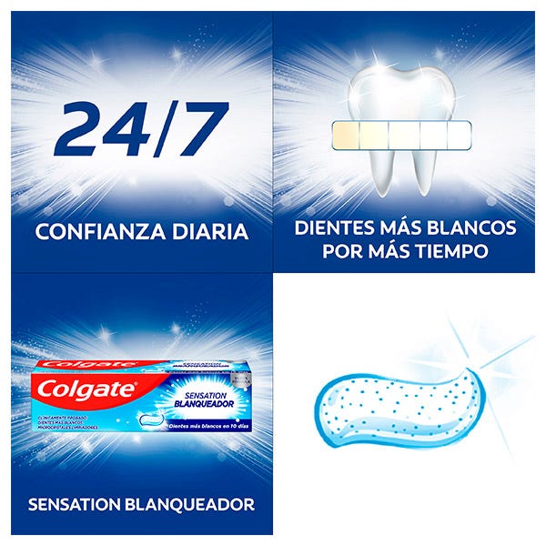 ¡Dientes más blancos en 10 días! Está clínicamente probado que Colgate Sensation Blanqueador con microcristales limpiadores limpia suavemente y blanquea eficazmente tus dientes. También ayuda a prevenir la formación de nuevas manchas, para que tus dientes se mantengan blancos durante más tiempo. Su sistema de limpieza de doble acción elimina 10 veces más manchas de la superficie que un dentífrico con flúor convencional. Este dentífrico Colgate Sensation Blanqueador es para un uso diario, refresca el aliento, protege contra la caries y elimina la placa bacteriana.