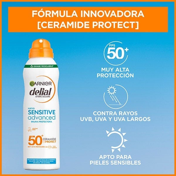 Protección solar fotoestable contra los rayos UVB, UVA incluso largos, y efectos de los Infrarrojos La bruma Sensitive Advanced ofrece protección muy alta IP50+, nuestra protección más completa contra los rayos  UVB y UVA incluso  largos, los rayos UV más numerosos y penetrantes, y algunos efectos de los infrarrojos ,causantes de daños celulares en la piel.