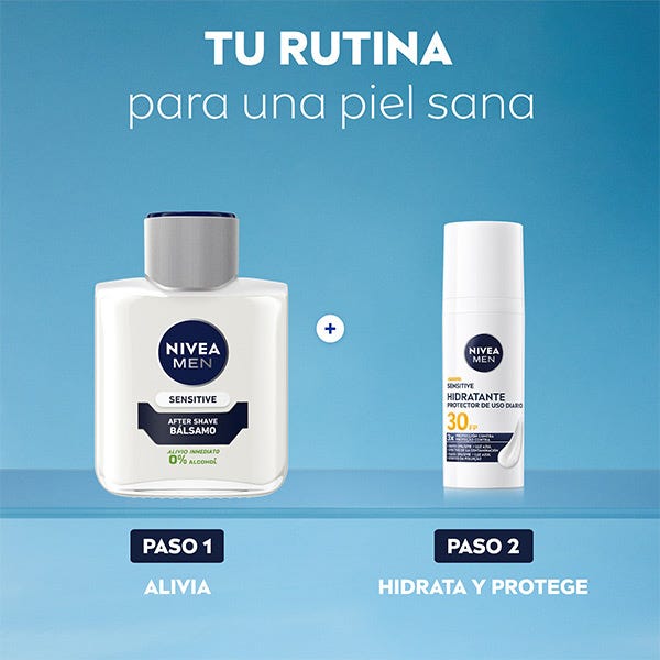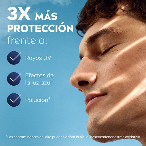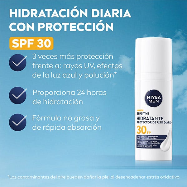 NIVEA MEN Sensitive Hidratante Protector protege la piel sensible con SPF30, Complejo VitaminPRO y antioxidantes. Ligera, no grasa y sin alcohol*, proporciona una triple protección contra los rayos UVA/UVB, la luz azul y la contaminación para una piel sana e hidratada durante todo el día.
