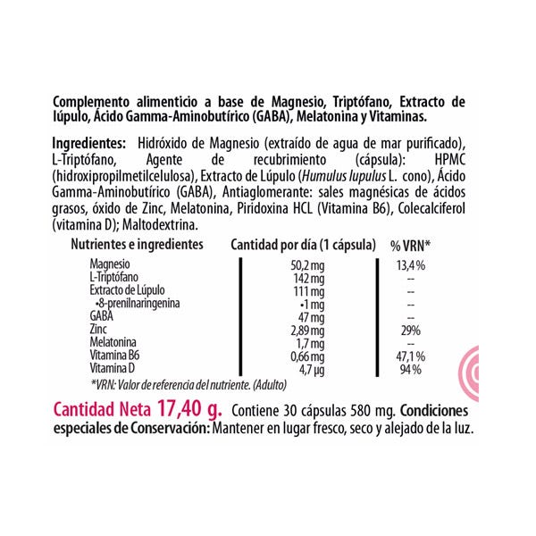 Hidroxido de Magnesio (extraído de agua de mar purificado), L-Triptófano, Agente de recubrimiento (cápsula): hidroxipropil metil celulosa y óxido de Zinc, Extracto de Lúpulo (Humulus lupulus L.), Ácido Gamma- Aminobutírico (GABA), Antiaglomerante: sales magnésicas de ácidos grasos, Melatonina, Piridoxina HCL (Vitamina B6), Colecalciferol (vitamina D); Maltodextrina.