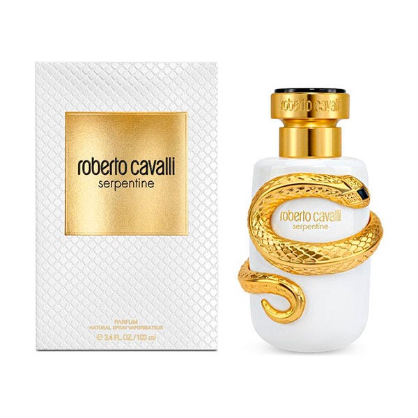 Serpentine es un perfume dinámico de intrépida sensualidad, diseñado para la mujer que se mueve con una confianza hipnótica, tentadora y sensual. El frasco refleja la opulencia de la fragancia que contiene. Está adornado con una serpiente dorada que envuelve el frasco blanco; este elemento distintivo evoca el diseño de los accesorios de moda de Roberto Cavalli.