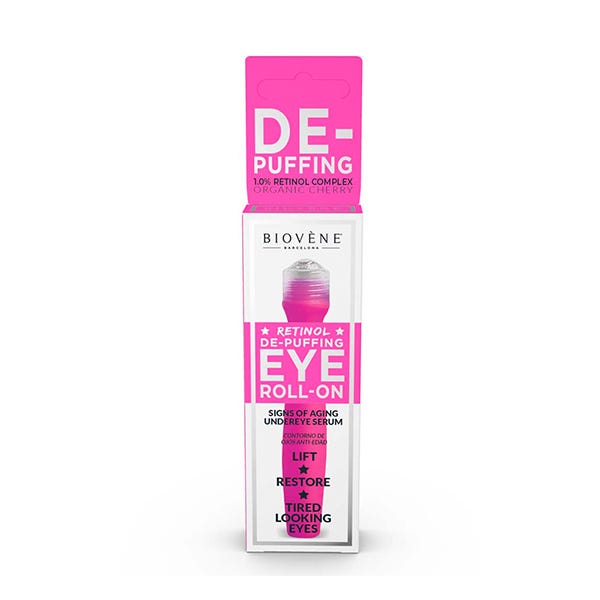 Sérum roll-on deshinchable y calmante para el contorno de ojos con retinol antienvejecimiento y cereza orgánica para levantar y ayudar a restaurar los ojos cansados.