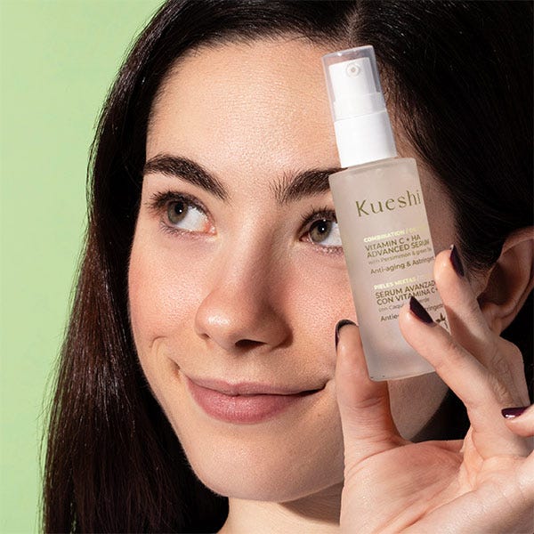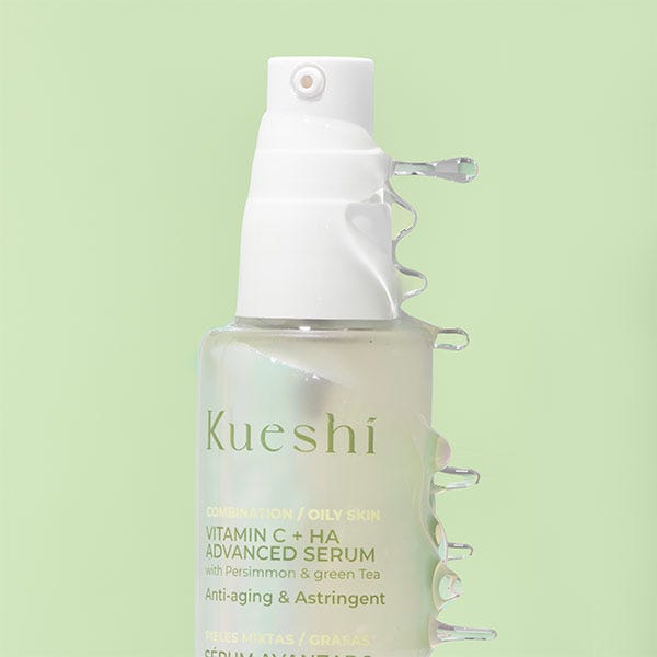 Sérum avanzado con Vitamina C + Ácido Hialurónico (HA) de Kueshi, enriquecido con Caqui y Té Verde, diseñado especialmente para pieles mixtas y grasas.