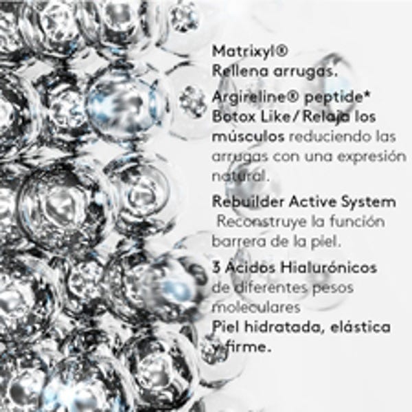 Cuenta con Ácido Hialurónico de 3 pesos moleculares, Péptidos con una actividad igual a los activos de medicina estética como Matrixyl®, que rellena las arrugas y el Argireline® peptide^ que es un Botox Like. Todo ello para tensar, alisar, reafirmar, reducir y rellenar la arrugas, con resultados en 3 horas: