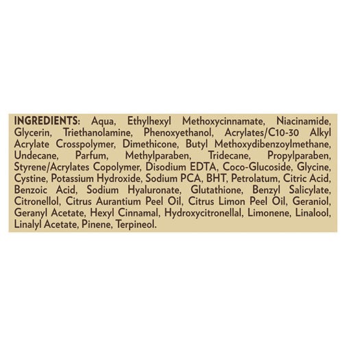 Aqua, Ethylhexyl Methoxycinnamate, Niacinamide, Glycerin, Triethanolamine, Phenoxyethanol, Acrylates/C10-30Alkyl Acrylate Crosspolymer, Dimethicone, Butyl Methoxydibenzoylmethane, Undecane, Parfum, Methylparaben, Tridecane, Propylparaben, Styrene/Acrylates Copolymer, DisodiumEDTA, Coco-Glucoside, Glycine, Cystine, Potassium Hydroxide, SodiumPCA, BHT, Petrolatum, Citric Acid, Benzoic Acid, Sodium Hyaluronate, Glutathione, Benzyl Salicylate, Citronellol, Citrus Aurantium Peel Oil, Citrus Limon Peel Oil, Geraniol, Geranyl Acetate, Hexyl Cinnamal, Hydroxycitronellal, Limonene, Linalool, Linalyl Acetate, Pinene, Terpineol.