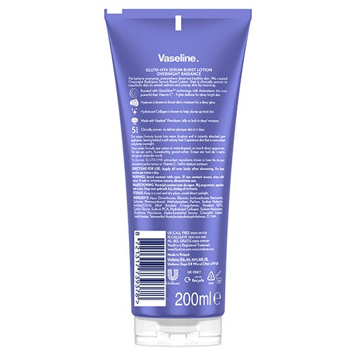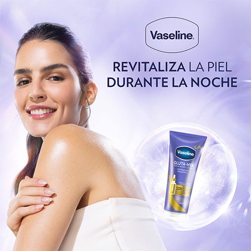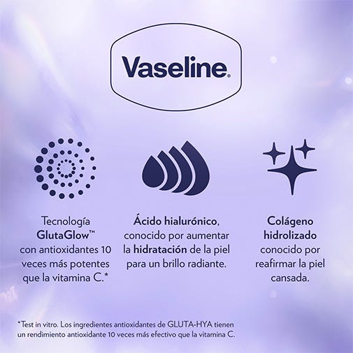 Revitaliza tu piel durante la noche con el sérum corporal Vaseline Gluta-Hya Overnight Radiance. Su fórmula única está potenciada por la tecnología GlutaGlow™, con antioxidantes 10 veces más potentes que la vitamina C1, para combatir la opacidad y lograr una piel radiante y luminosa. Este sérum corporal también está elaborado con ácido hialurónico, colágeno hidrolizado y vaselina para potenciar la hidratación de la piel y retener la hidratación profunda2, a la vez que ayuda a reafirmar la piel cansada.
