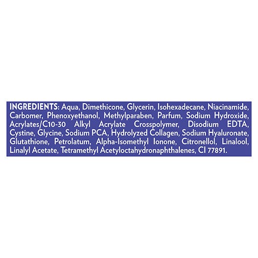 Aqua,Dimethicone, Glycerin, Isohexadecane, Niacinamide, Carbomer, Phenoxyethanol, Methylparaben, Parfum, Sodium Hydroxide, Acrylates/C10-30Alkyl Acrylate Crosspolymer, DisodiumEDTA, Cystine, Glycine, SodiumPCA, Hydrolyzed Collagen, Sodium Hyaluronate, Glutathione, Petrolatum, Alpha-Isomethyl Ionone, Citronellol, Linalool, Linalyl Acetate, Tetramethyl Acetyloctahydronaphthalenes, CI 77891.