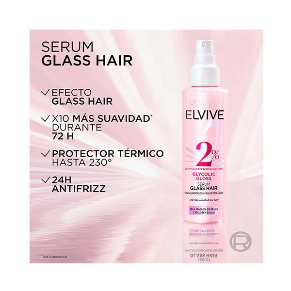 *Tests instrumentales - Envuelve la fibra capilar con una capa de brillo y protege del calor hasta 230º. - Con un 2% [Complejo con Ácido Hialurónico].