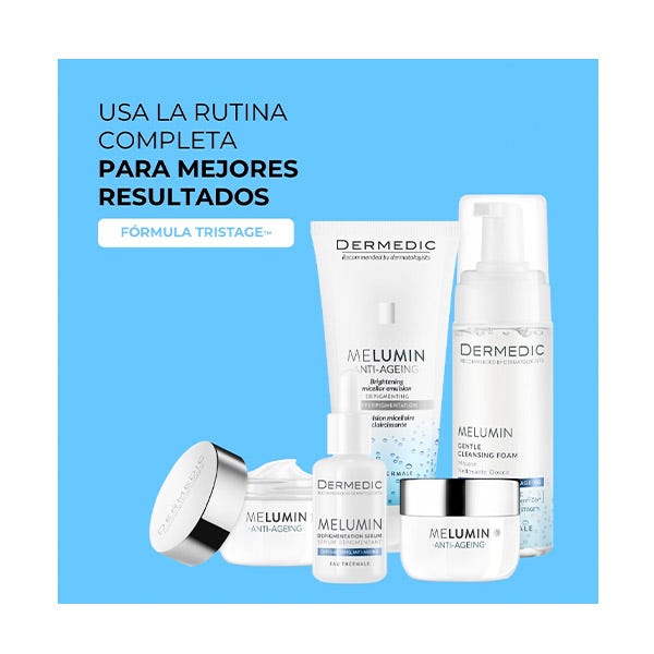 El innovador complejo Melumin Tristage™, incluido en la fórmula, con solicitud de patente, actúa en múltiples direcciones mediante una combinación sinérgica de ingredientes despigmentantes: