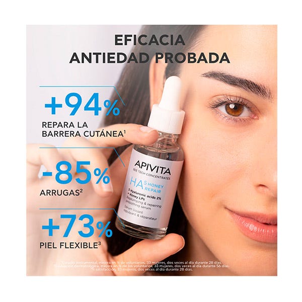 El Sérum Reparador HA5 Miel potencia el poder de la sinergia rellenadora del ácido hialurónico y la miel para reducir visiblemente las arrugas y alisar la piel.