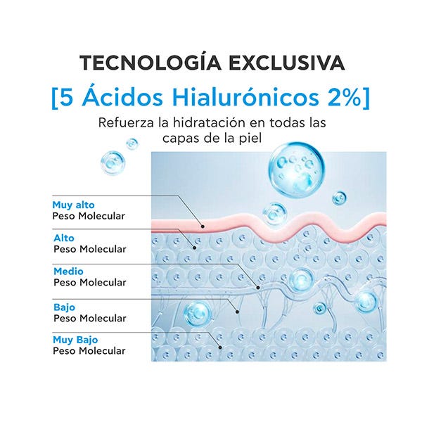 Este contiene el más amplio espectro existente de 5 pesos moleculares de ácido hialurónico al 2% que recupera la hidratación en todas las capas de la piel.