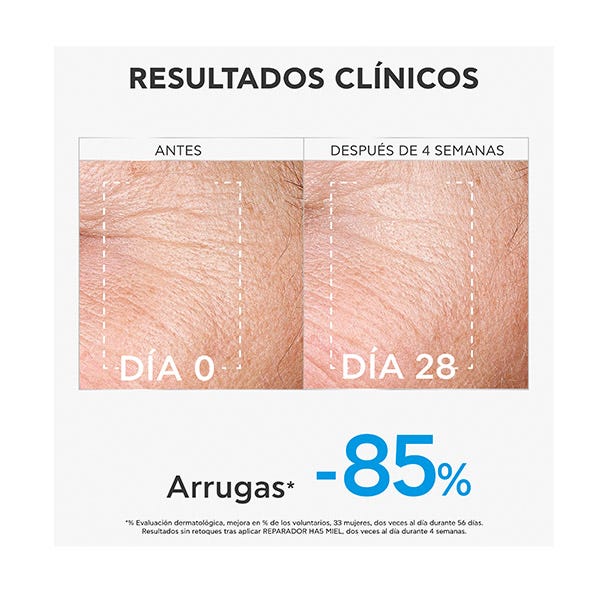 Estudio clínico instrumental, mejora en % de los voluntarios, 33 mujeres, 2 veces al día durante 28 días de uso. * Evaluación dermatológica, mejora en % de los voluntarios, 33 mujeres, 2 veces al día 56 días de uso. *** % satisfacción, 33 mujeres, 2 veces al día 28 días de uso.